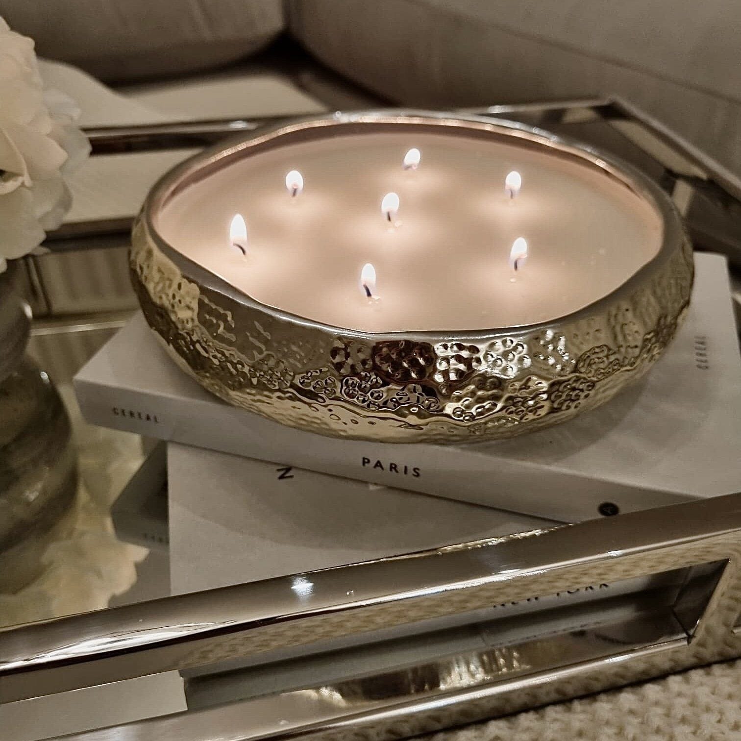 Create an ambient glow in your home with the beautiful Aeolian Candle. This stunning vanilla-scented candle has an impressive 7 wicks, housed in a stunning champagne-coloured holder that will look beautiful in a warm-toned scheme.