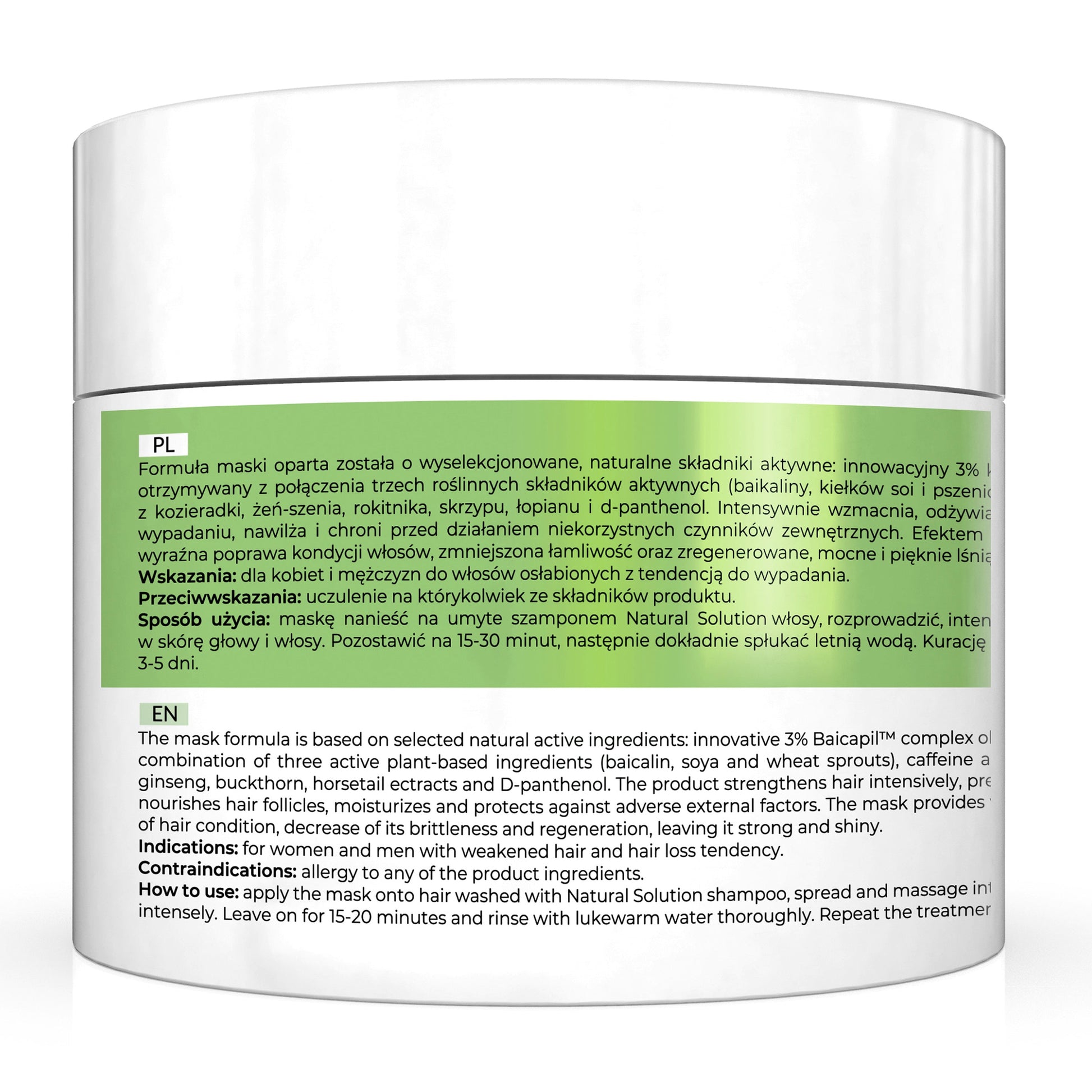 Apis Natural Solution Strengthening Anti‑Hair Loss Hair Mask is an intensive, spa‑grade mask for men and women with weakened strands prone to shedding. Infused with a 3 % Baicapil™ complex (derived from baikalin, soybean and wheat sprouts), plus caffeine, fenugreek, ginseng, sea buckthorn, horsetail, burdock extracts and D‑panthenol, this mask fortifies hair follicles, deeply nourishes, hydrates and shields against environmental stressors. The result: visibly stronger, smoother, shinier and more resilient hair.