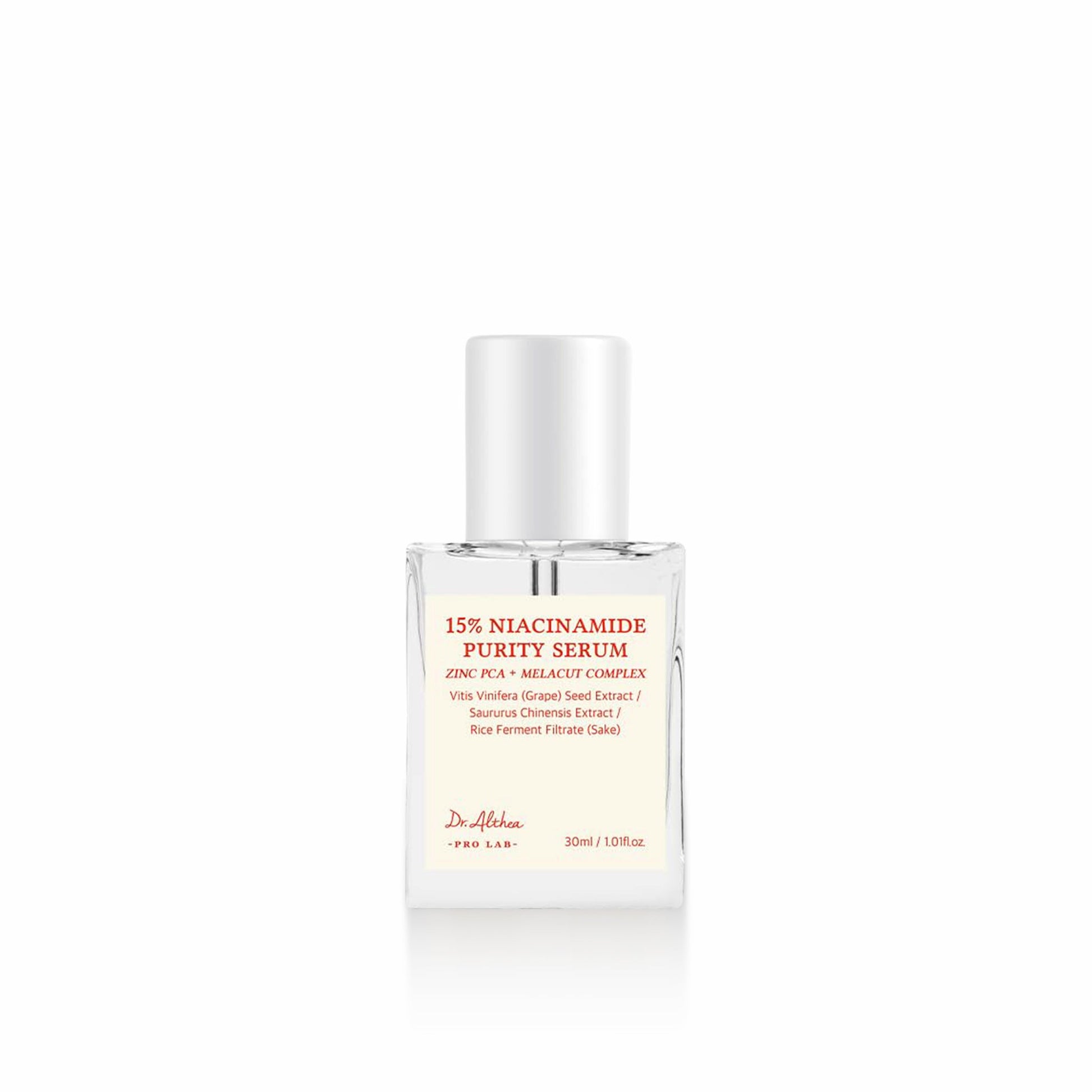 DR ALTHEA 15% Niacinamide Purity Serum is a lightweight, fast-absorbing essence designed to improve skin texture and enhance radiance. Enriched with 15% highly concentrated niacinamide, rice ferment filtrate, Zinc PCA, and purslane extract, it helps reduce dark spots, soothe irritated skin, regulate sebum, and maintain hydration. Suitable for all skin types, including sensitive skin, this EWG Green Grade formula is free from artificial colorants, ensuring gentle yet effective skincare.