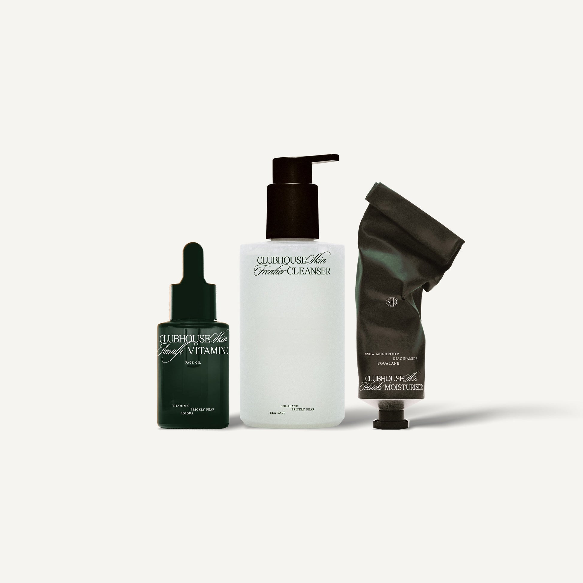 The full Clubhouse Skin set harnesses nature's most potent ingredients in to a simple daily ritual. Clear your skin of dirt build up with the Frontier Cleanser, protect against damage with the Amalfi Vit-C oil and nourish with the Helsinki Moisturiser.
