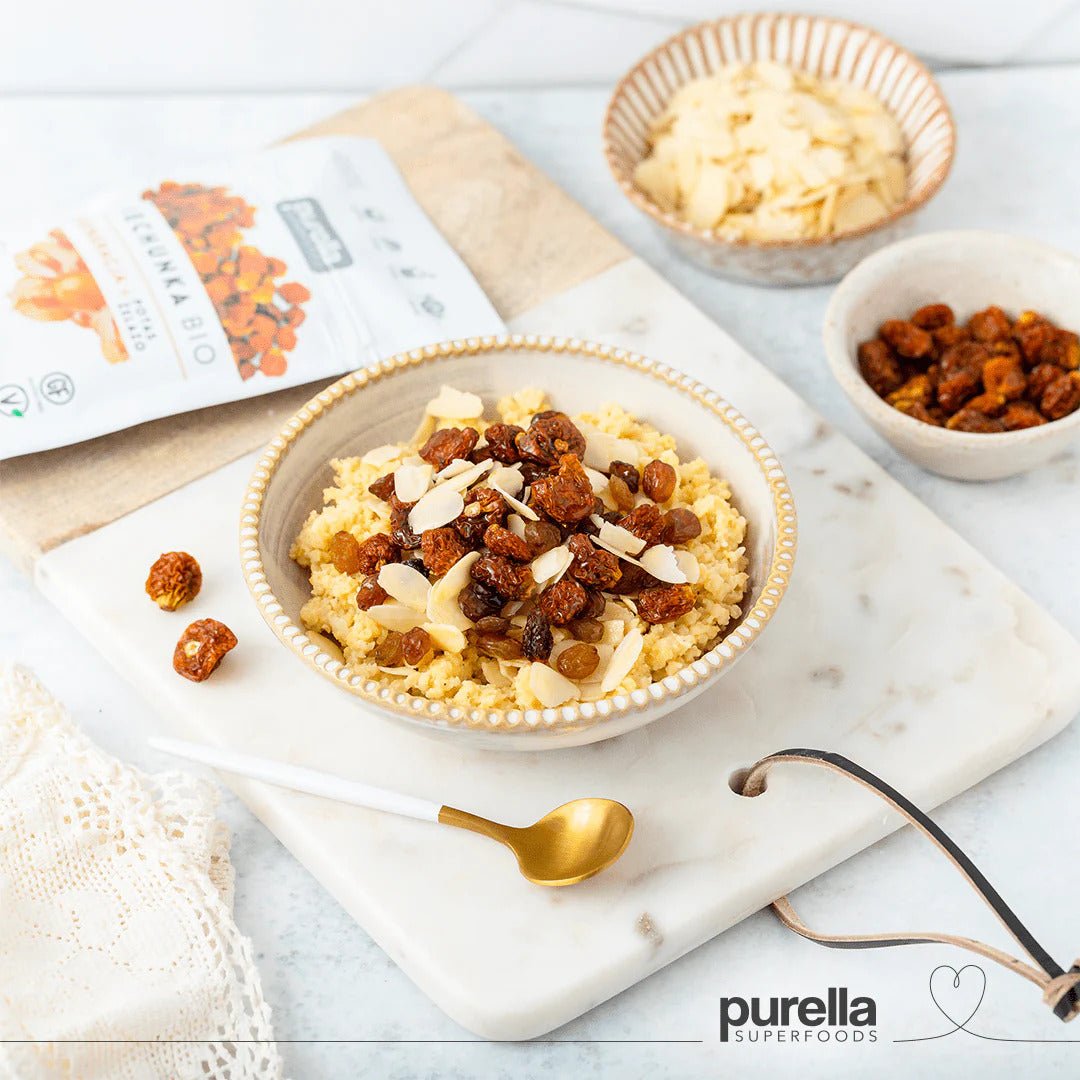 Peruvian physalis fruits are a rich source of dietary fibre. They also support beauty as they are a source of potassium, which helps in the proper functioning of the nervous system and muscles and in maintaining normal blood pressure. Beneficial effects occur when 1 teaspoon is consumed.